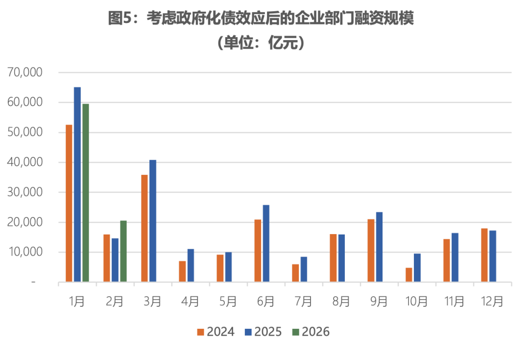 在此背景下,国际局势带来的油价上涨或进一步加速物价回升过程。如果油价上涨是一个短期冲击,那么对中国而言就不是一个坏的通胀。因为过去几年,中国经济面临的最大风险就是持续的低通胀状态。现阶段,中国的国内需求正在经历缓慢的复苏,居民资产负债表也开始修复。这种情况下,来自供给端的价格冲击能够加速价格水平的提升,对中国经济尽快走出低通胀状态、进入正反馈过程是个有利因素。如果油价在中长期保持高位,对中国的实际影响是相对可控的。主要原因是:虽然中国的原油消费大量依赖进口,但在中国的能源消费体系中,煤炭占比要明显大于原油。中国新能源体系的快速发展也会减少一部分对原油的需求。因此,原油价格上涨或给能化行业造成成本压力,行业间的差异会比较大,但对整体制造业成本和利润的冲击相对可控,大概率不会改变现在制造业的复苏趋势。第三,宏观政策的发力或将继续保持平稳,货币政策在短期内持续放松的必要性在下降。从1-2月的社会融资规模数据看,居民部门还在继续缩表,但企业部门的信贷扩张动能并未减弱。在考虑政府化债对存量信贷的抵消效应后,前两个月企业部门的信贷规模与2025年基本持平。