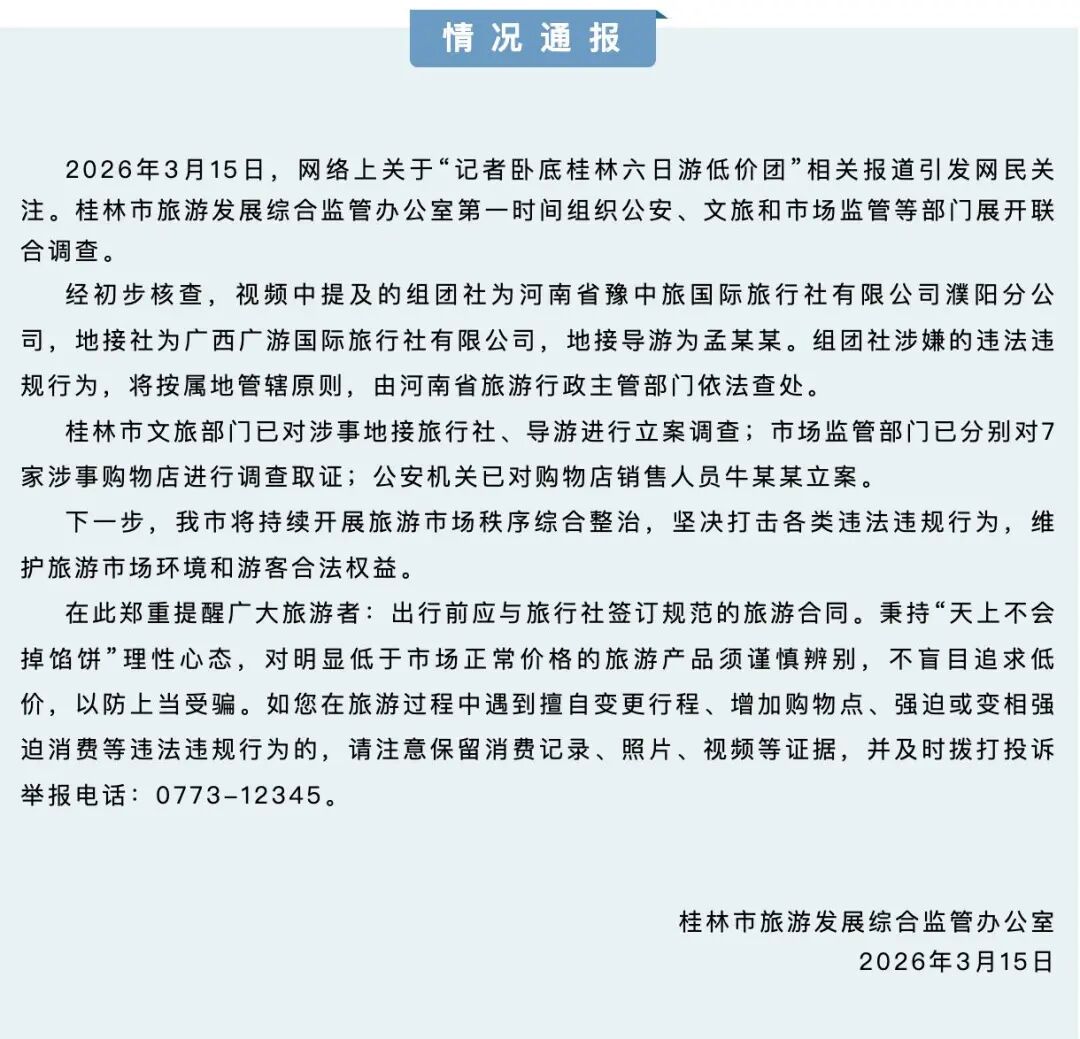 2026年3月15日,网络上关于“记者卧底桂林六日游低价团”相关报道引发网民关注。桂林市旅游发展综合监管办公室第一时间组织公安、文旅和市场监管等部门展开联合调查。