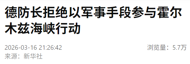 据新华社3月16日消息,德国国防部长皮斯托里乌斯16日在柏林表示,德国拒绝美国提出的为保障霍尔木兹海峡航行安全提供军事支持的要求。