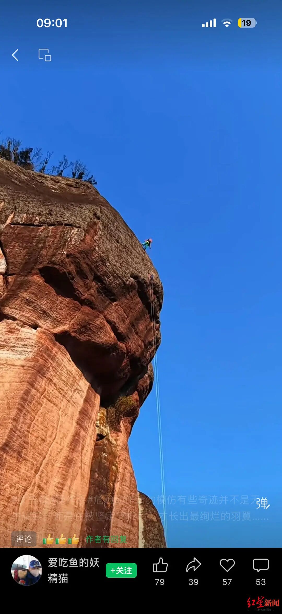 ▲“猫姐”视频号里发布的户外岩降视频