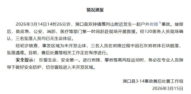事故发生后,湖口当地成立善后处置工作组。3月15日,工作组发布通报称,3月14日14时26分许,湖口县双钟镇真雁列山附近发生一起户外岩降事故。接报后,县应急、公安、消防、医疗等部门第一时间赶赴现场开展救援。经120医务人员现场确认,三名坠落人员均已无生命体征。
