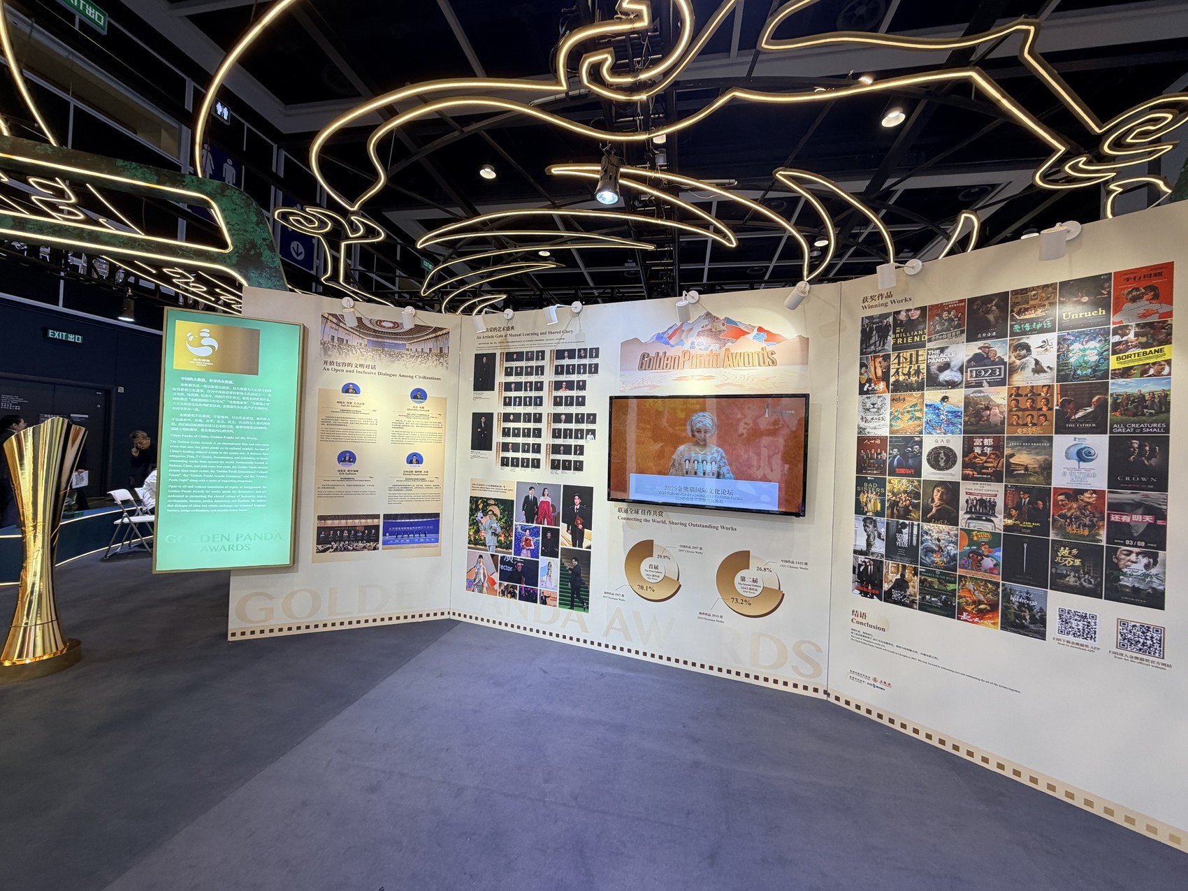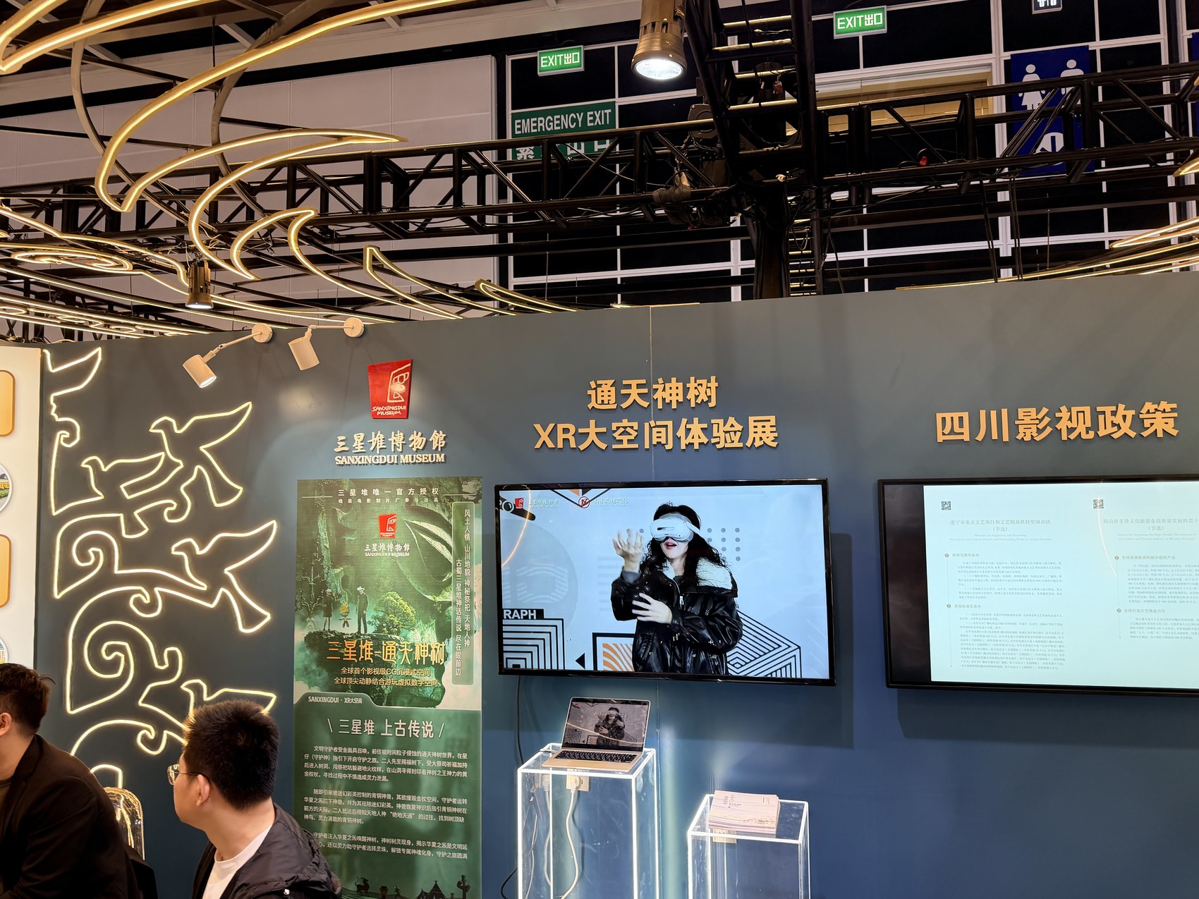 四川馆规划为金熊猫奖、作品展示、机构推介、政策活动、影旅融合、科技体验、多功能区七大板块。作品展示区精选《哪吒之魔童闹海》《八仙!》等20余部“四川造”影视作品;科技体验区引入《三星堆通天神树》XR数字空间,现场不少嘉宾戴上头显设备,沉浸式感受古蜀文明的视觉呈现,体验科技与文化的融合;多功能区则将举办市州推介、项目路演、动画IP发布等20余场专题活动。