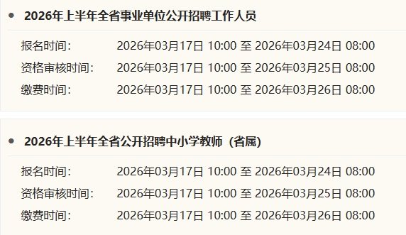 3月17日上午10∶00,四川省2026年上半年事业单位公开招聘、中小学教师招聘报名启动。本次招聘采取网络报名方式,报名网站为四川省人力资源和社会保障厅官网“人事考试”专栏,截止时间为3月24日早上8∶00。笔试将于4月25日至26日进行。