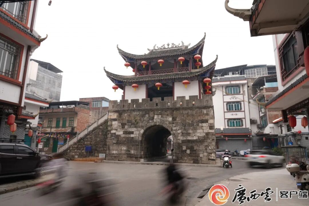 3月12日,南国春意正浓。清晨薄雾,轻轻笼住龙江河畔的宜州九街十八巷。阳光穿雾而来,老城区东大街上,三层飞檐的四牌楼渐渐清晰。青瓦覆顶,红灯轻摇,青石墙带着岁月的斑驳。四个门洞连通东南西北街巷,门楣石匾刻着“东日流晖”“丹霞雪霁”等四个牌匾,笔力苍劲,历经数百年风雨,字迹依旧清晰。