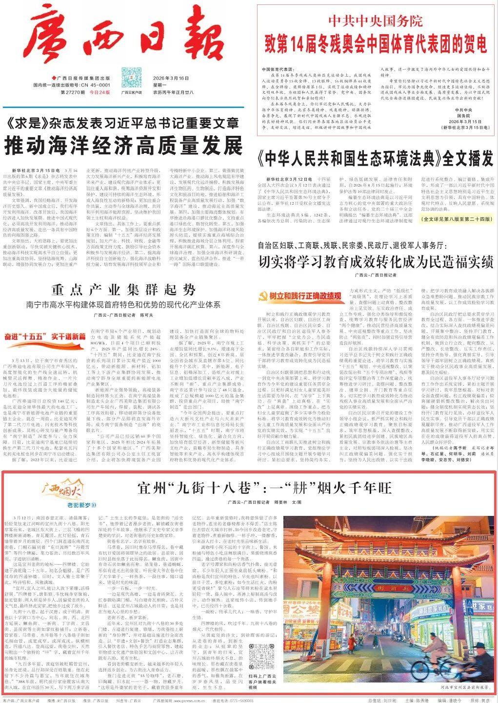 3月16日《广西日报》头版刊发文章