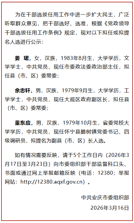 ●3月16日,中共安庆市委组织部发布干部任前公示公告。