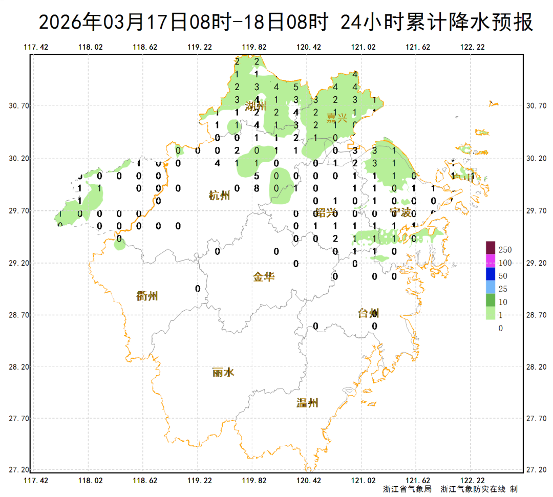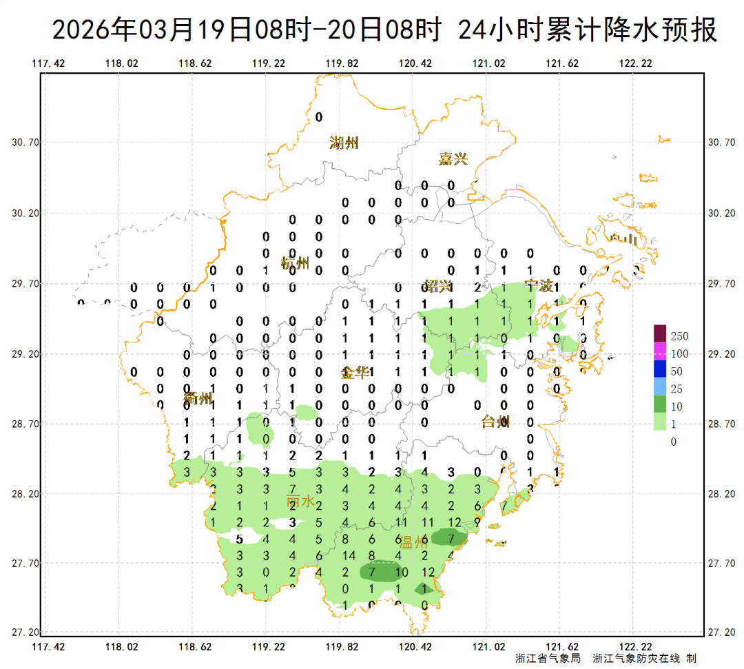 3月25日:浙北地区雨止转阴到多云;其它地区阴有阵雨。