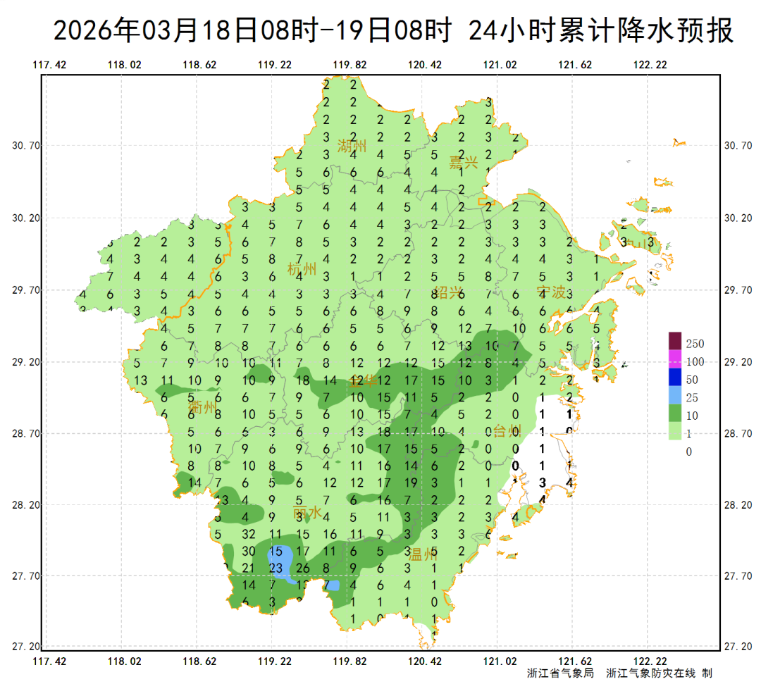 明天(18日)将会是本轮降水“最强档期”,浙中南部分将会出现中雨量级,请关注。