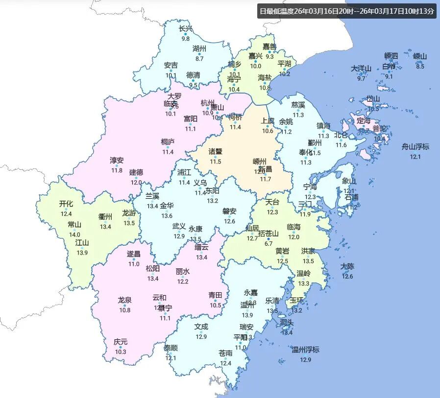 同样是浙江,今天的温差却有点“分裂”。今天早晨的最低气温:全省大部都在10℃左右,比较舒适~