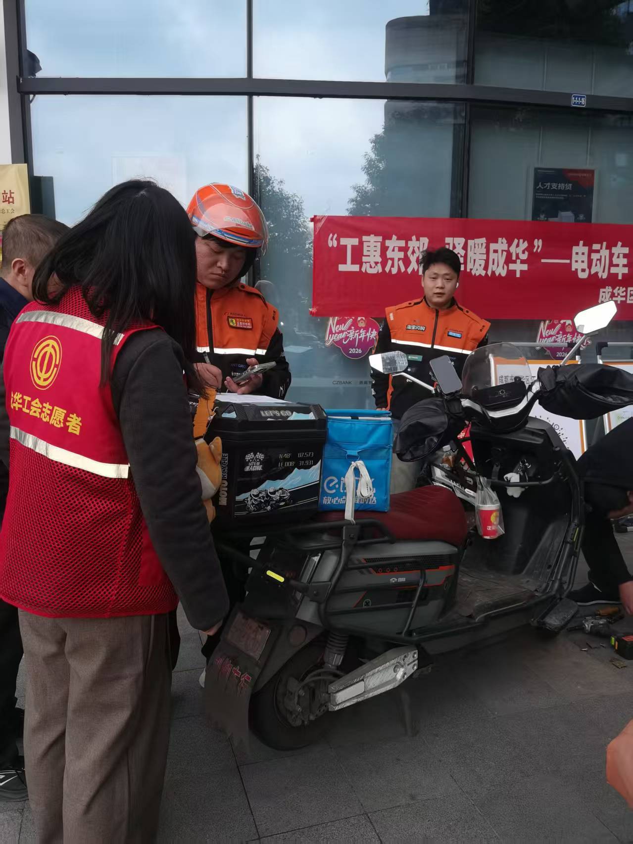 这一天,由成都市成华区总工会主办的“工惠东郊·驿暖成华”——电动自行车“义检义修”专项活动,在成华区工会驿站·跳蹬河街道浙商银行成华支行及朴朴超市(成华崔家店)两个点位同步开展。活动瞄准网约配送员、快递小哥等新就业形态劳动者的实际需求,将免费的车辆专业检修服务直接送到他们工作的站点旁。