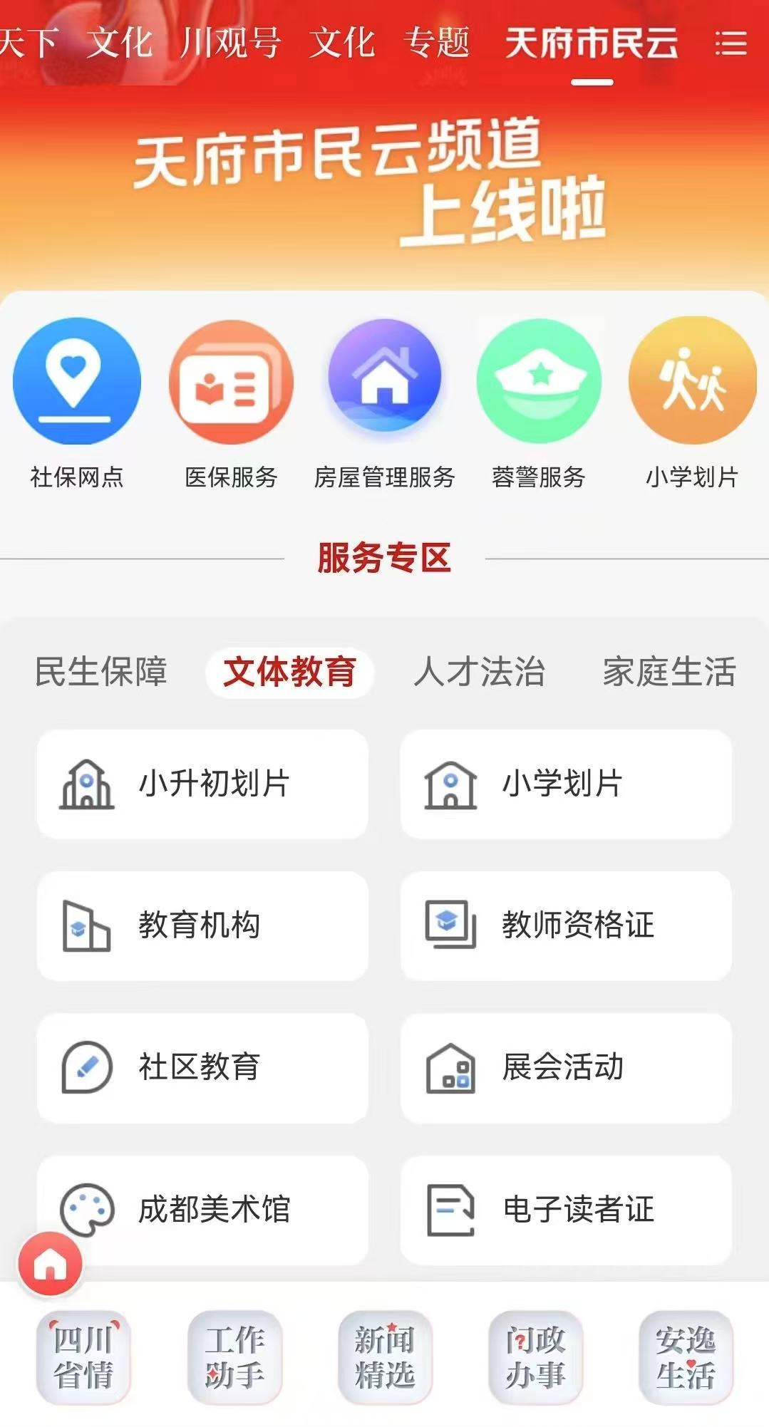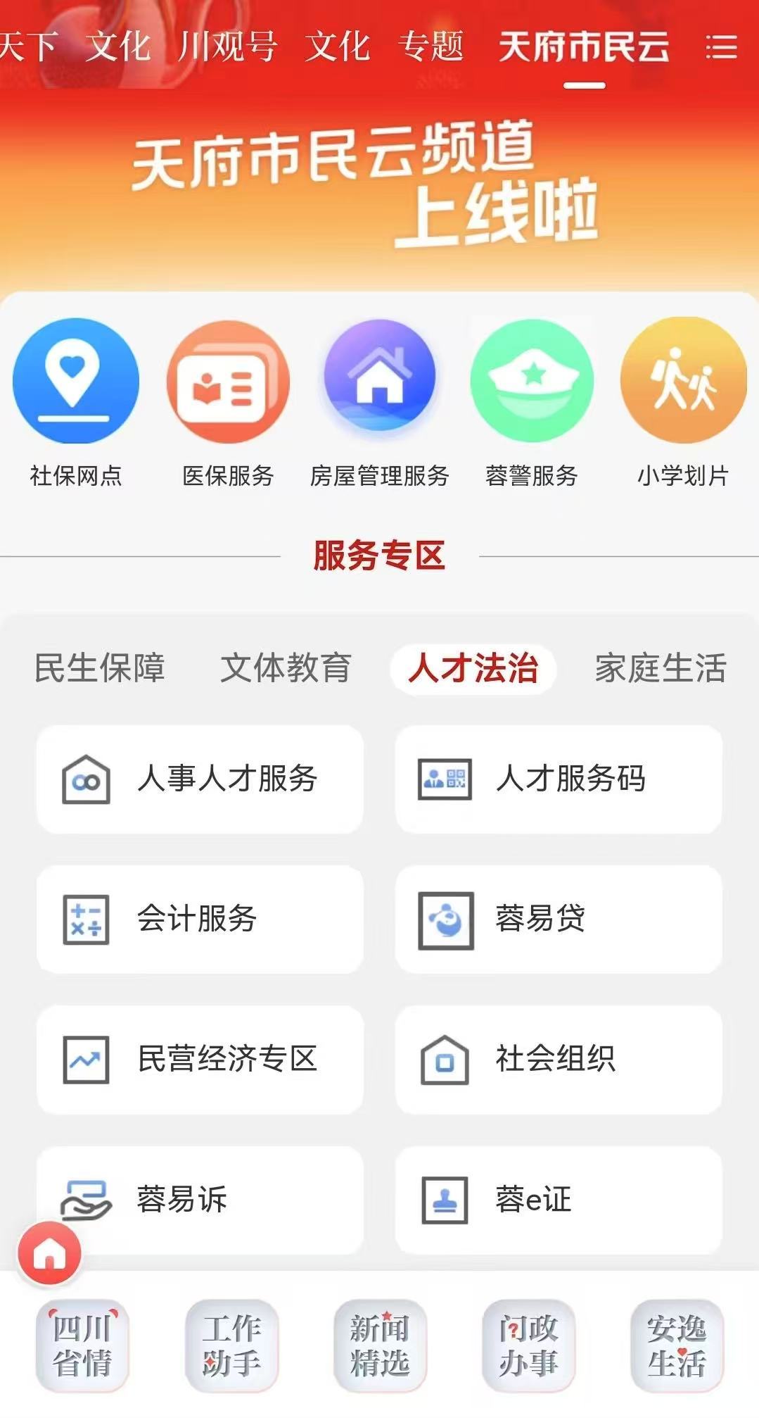 此次接入“天府市民云”频道的48项服务功能,主要包含民生保障、文体教育、人才法治、家庭生活4大类。