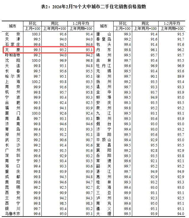 2月份,一线城市二手住宅销售价格同比下降7.6%,降幅与上月相同。其中,北京、上海、广州和深圳分别下降8.4%、6.2%、8.5%和7.1%。二线城市二手住宅销售价格同比下降6.2%,降幅与上月相同。三线城市二手住宅销售价格同比下降6.3%,降幅扩大0.2个百分点。