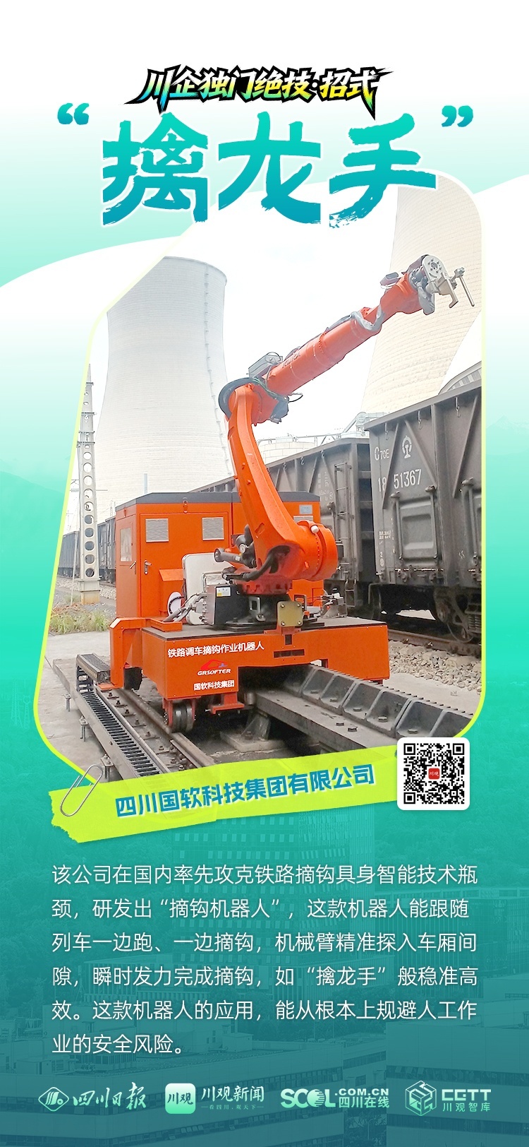 这台身手不凡的编组场“擒龙手”,由四川国软科技集团有限公司研发制造。这家公司在国内率先攻克铁路摘钩具身智能技术瓶颈,实现摘钩无人化操作。场景与核心技术融合,这家川企如何练就“独门绝技”?近日,川观新闻记者走进该公司,一探究竟。