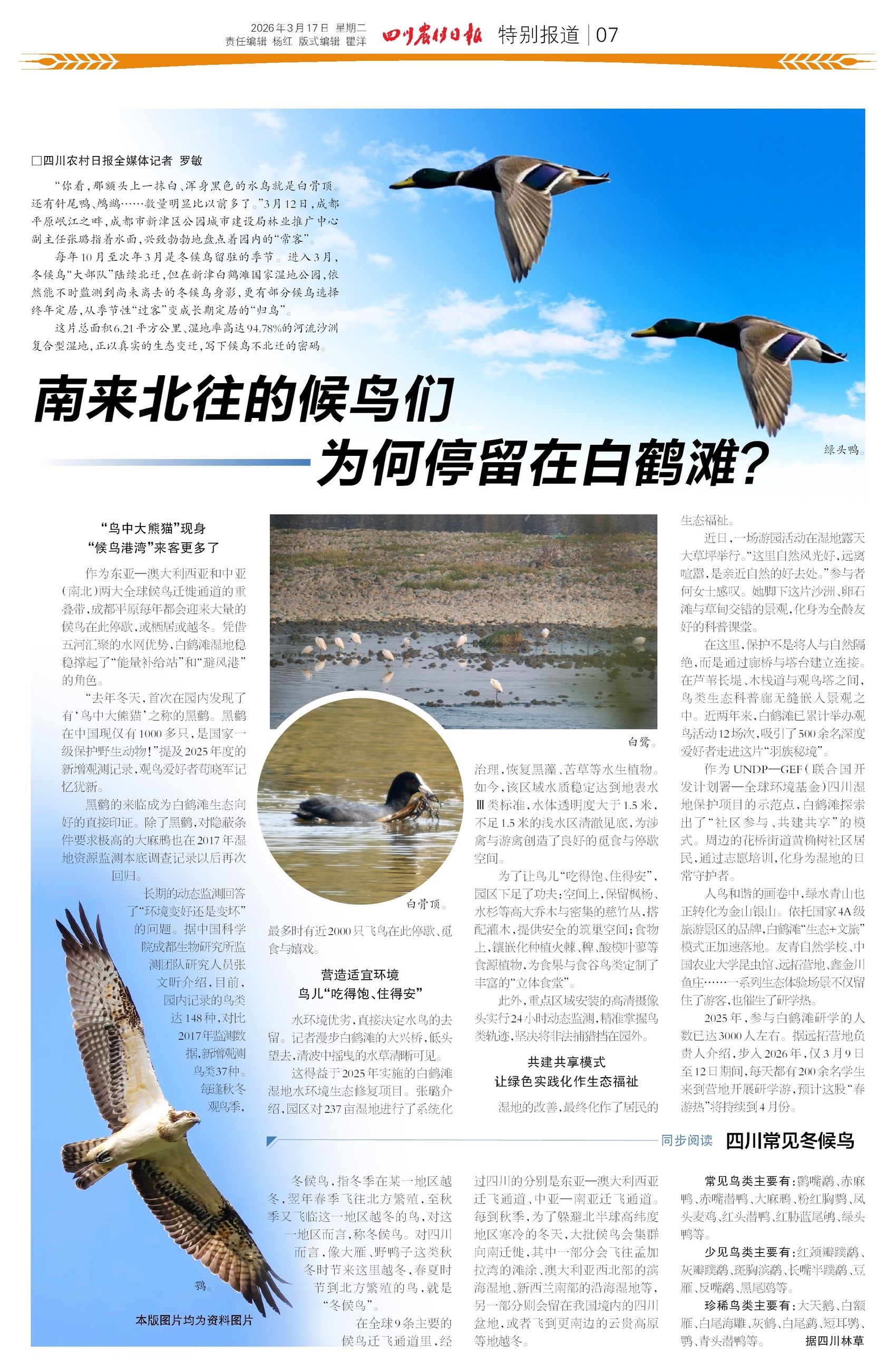 “鸟中大熊猫”黑鹳悄悄现身成都白鹤滩,148种鸟儿把这儿当成了“永久定居点”。水下森林清澈见底,鸟儿食堂管饱管够,还有24小时安保巡逻,更绝的是,人鸟还能和谐共处。孩子们边玩边学,一年3000多人来研学。绿水青山真的变金山银山,鸟儿住得舒心,村民赚得开心!