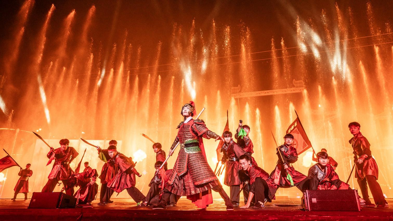 成都是三国文化重镇。小镇另一部核心作品《马超镇守都江堰》则以6000平方米真实沙场为舞台,演绎马超临危受命镇守都江堰的传奇故事,生动塑造马超、诸葛亮、刘备等三国英雄形象。现场还原的城楼、军营等场景,让观众身临其境感受三国风云、跌宕起伏。