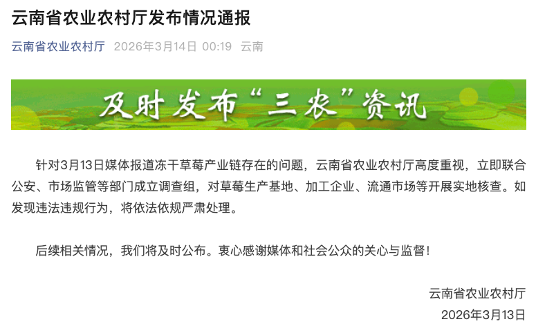 企业自曝家丑,是行业乱象的无奈曝光,更是倒逼监管提速的契机。3月14日,云南省农业农村厅发布情况通报,表示已联合公安、市场监管部门成立调查组,全链条核查种植基地、加工企业、流通市场,彰显了监管部门直面问题的决心。