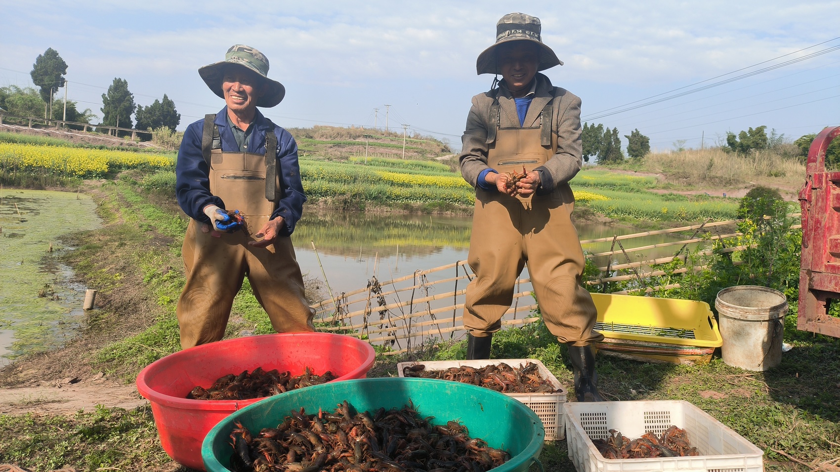 3月11日下午,荣县东佳镇赵家桥村的稻虾田边一派繁忙景象。随着一声“起笼”令下,虾农们熟练地提起水中地笼,顷刻间,一只只青壳白肚的小龙虾活蹦乱跳地落入虾筐,水花四溅。
