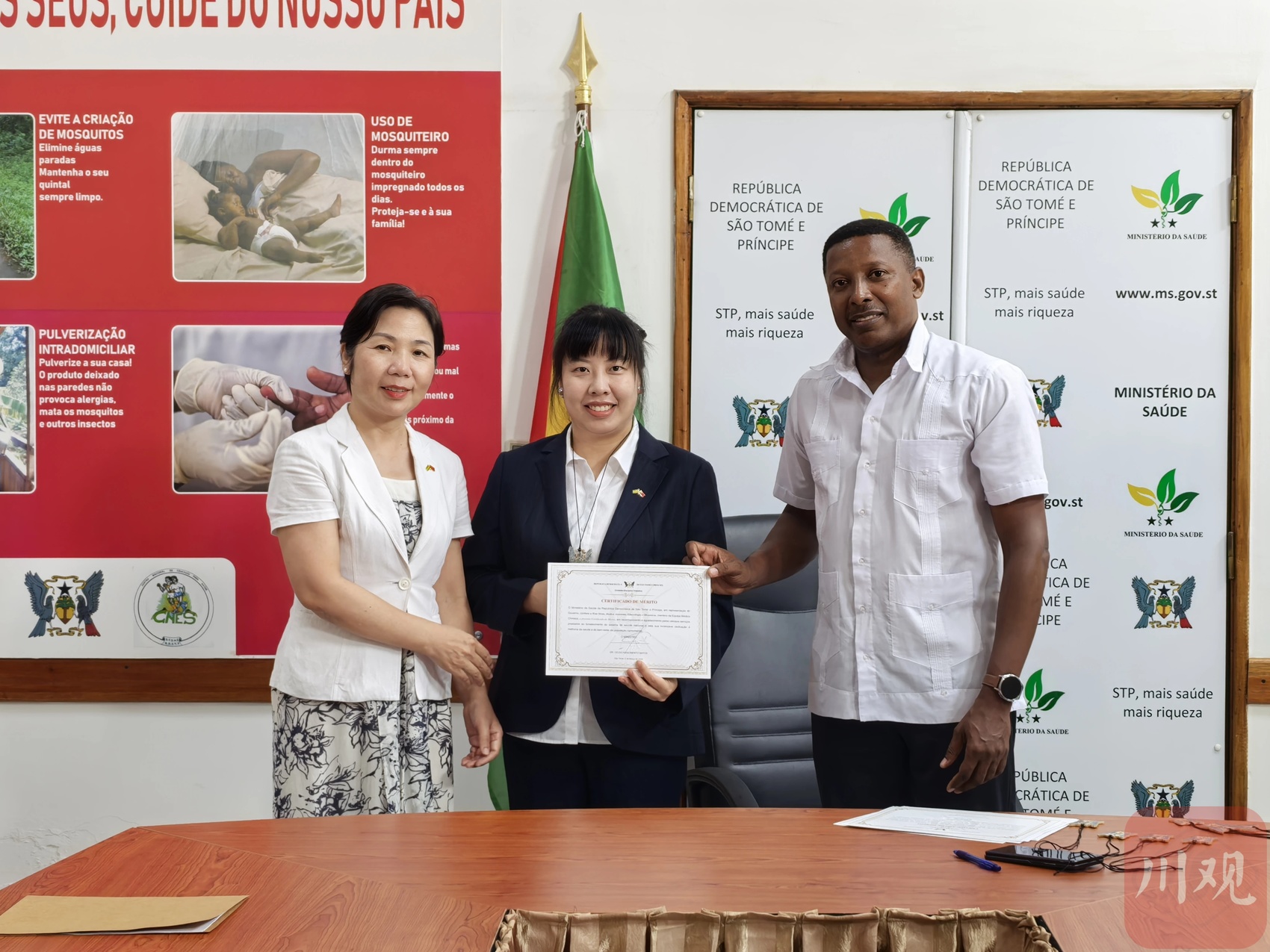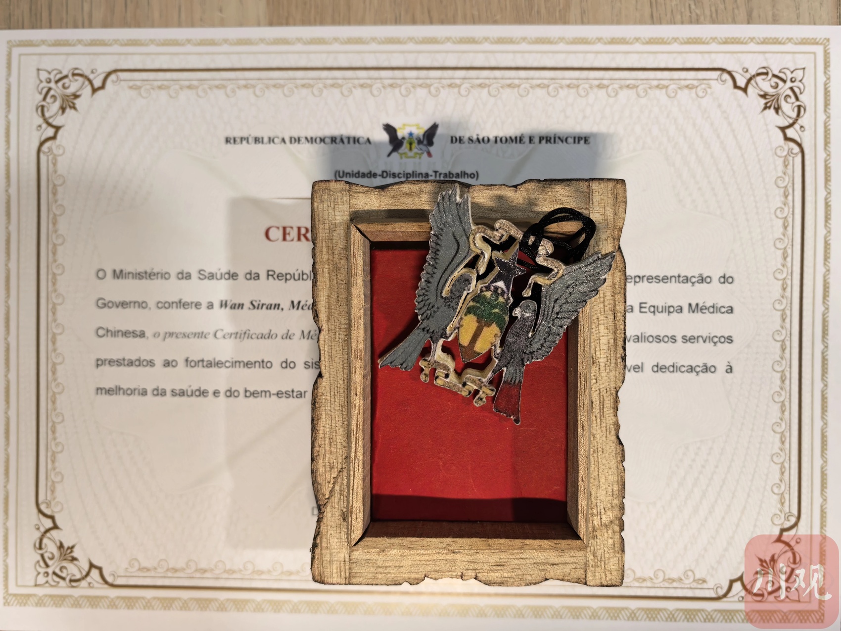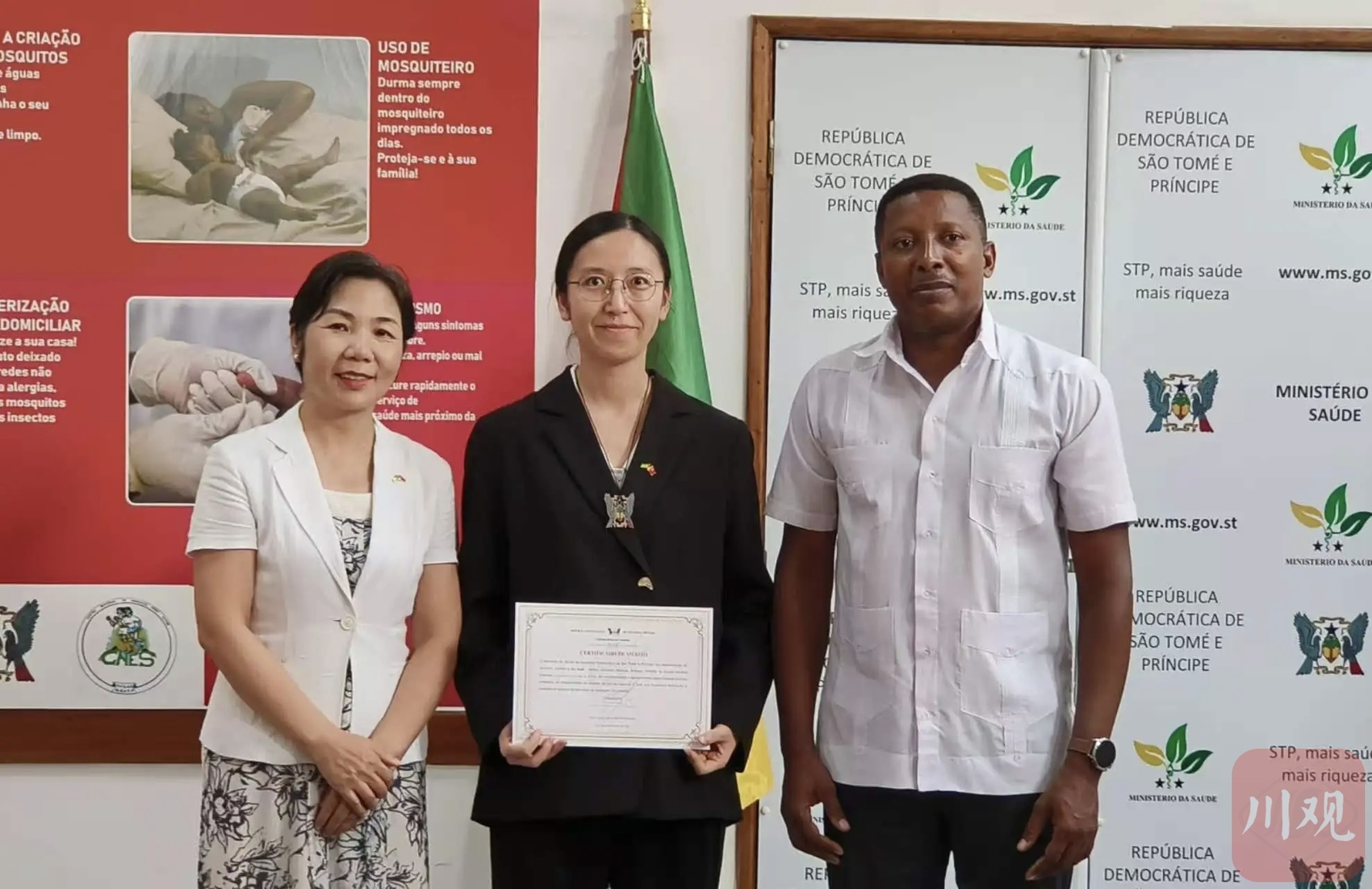 当地时间2026年3月,在非洲岛国圣多美和普林西比民主共和国(简称“圣普”),第19批援圣普中国医疗队队员、雅安市人民医院/雅安市妇幼保健院(以下简称:市人民医院)医师万思然、胡赛娣,荣获圣普卫生部代表政府授予的“国家奖章”,并获圣普国家中心医院颁发荣誉证书。