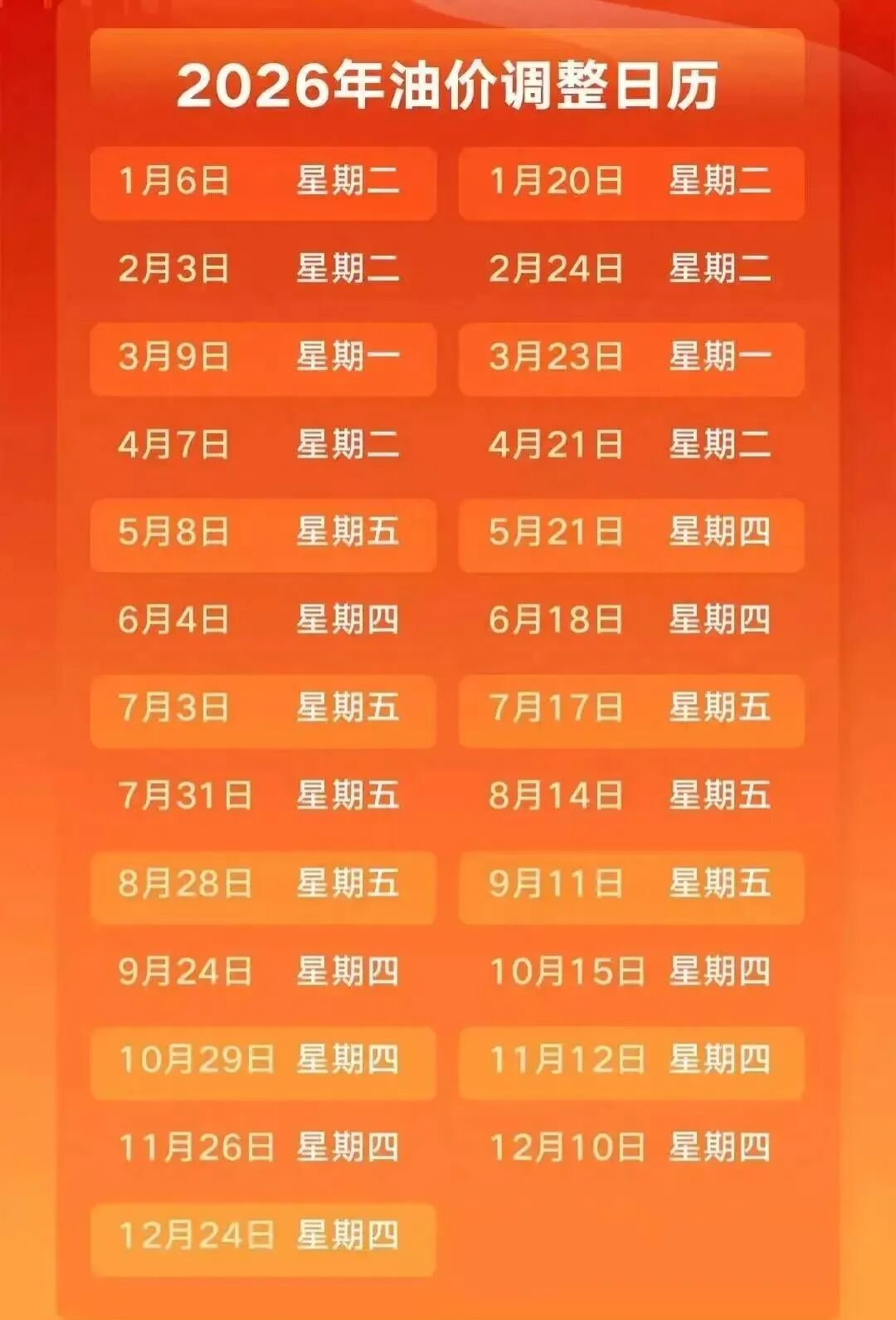 本年度油价调整日历