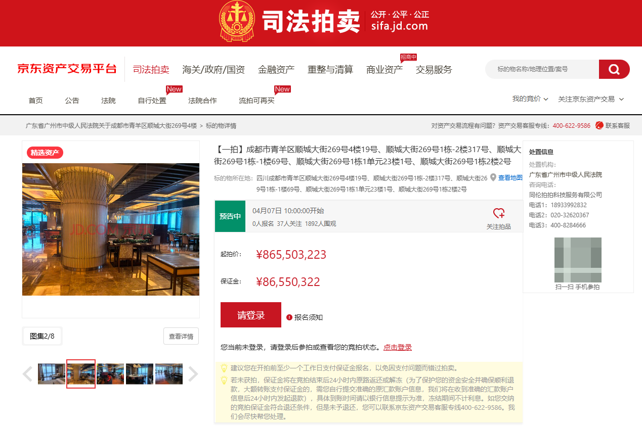 3月17日,川观新闻记者从京东资产交易平台获悉,成都富力丽思卡尔顿酒店所在房产标的物,被广州市中级人民法院挂网处置,将于2026年4月7日10时起至2026年4月8日10时止(延时的除外)在京东网络司法拍卖平台进行公开拍卖。