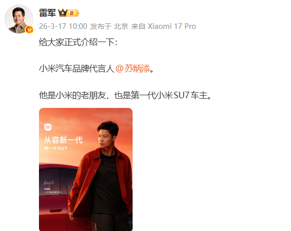 3月17日,小米汽车官方及雷军正式宣布,中国短跑名将苏炳添担任小米汽车品牌代言人。作为小米的老朋友及第一代小米SU7车主,苏炳添对车辆的评价为“信任”,其不断超越自我的体育精神与小米汽车追求极致速度的品牌理念高度契合。