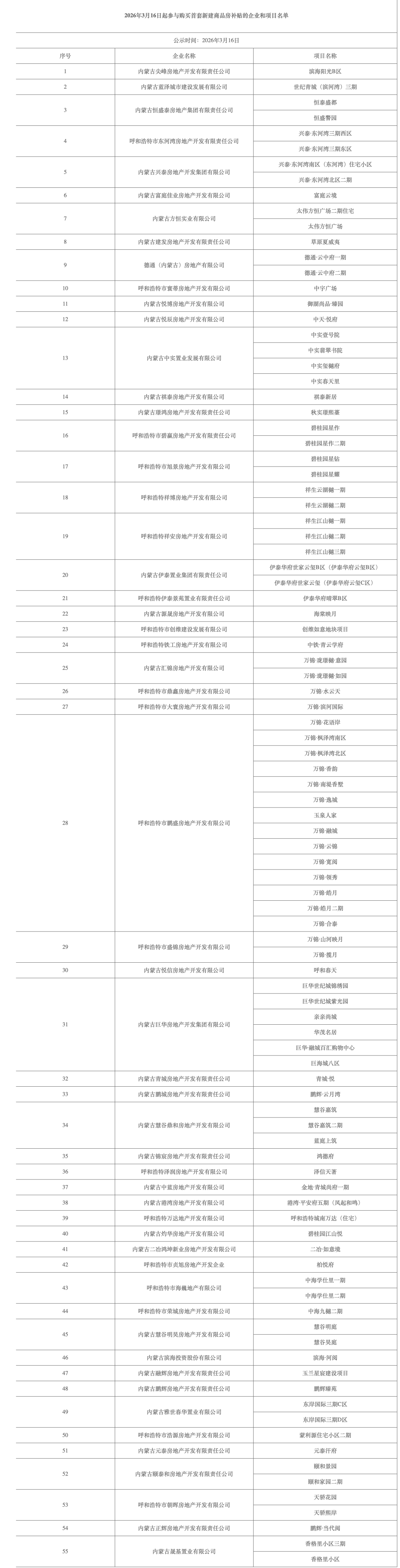 根据《呼和浩特市住房和城乡建设局 呼和浩特市财政局关于<呼和浩特市人民政府关于促进人口集聚 推动人口高质量发展的实施意见>中购买首套新建商品住宅补贴相关事宜的通知》(呼住建联发〔2026〕11号)要求,从2026年3月1日起购买首套新建商品住宅补贴政策调整为:“房地产开发企业自愿参加购房补贴政策的,向市住建局申请”,经汇总,2026年3月16日起有55家房地产开发企业、97个项目参与补贴,较2026年3月1日新增10家房地产开发企业、14个项目。市住建局为参与补贴项目统一制作标识,请购房人认准标识,购买不在名单内的项目不享受购买首套新建商品住宅补贴政策。具体名单公示如下。