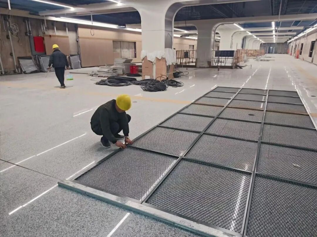 长春南湖大路在建的地铁站里,一位工人头戴安全帽蹲在地上,专注地安装着黑色金属网格板。他面前的格栅,已拼成规整的矩形阵列,金属框架与菱形网孔整齐紧密。
