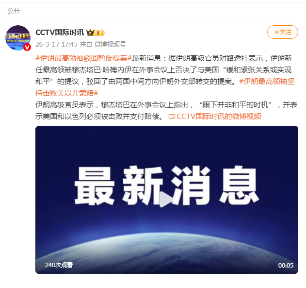 据伊朗高级官员对路透社表示,伊朗新任最高领袖穆杰塔巴·哈梅内伊在外事会议上否决了与美国“缓和紧张关系或实现和平”的提议,驳回了由两国中间方向伊朗外交部转交的提案。