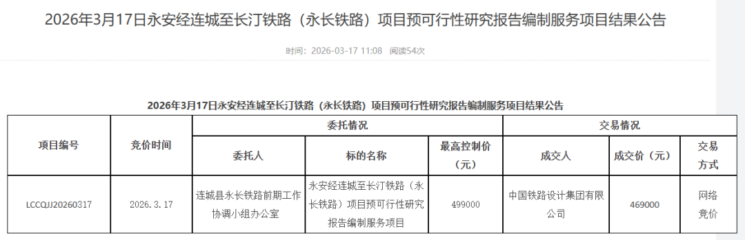 3月17日《永安经连城至长汀铁路(永长铁路)项目预可行性研究报告编制服务项目结果公告》发布,中国铁路设计集团中标该项目。