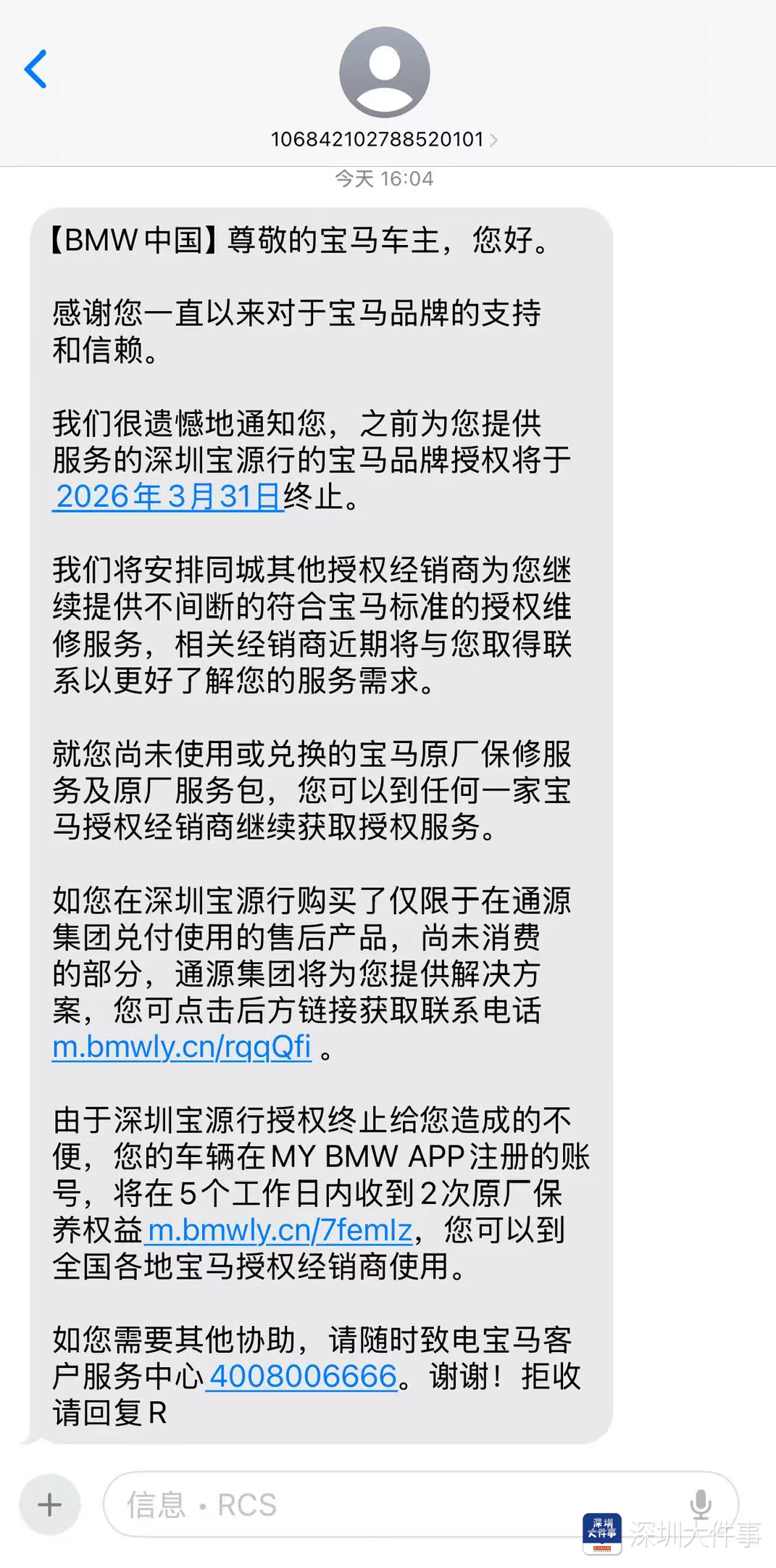 与此同时,有部分宝马车主及MINI车主反映称,收到了BMW中国短信通知,“宝源行的宝马品牌授权将于2026年3月31日终止。BMW中国将安排同城其他授权经销商继续提供不间断的符合宝马标准的授权维修服务,相关经销商近期将与车主取得联系以更好地了解服务需求。”其中“尚未使用或兑换的宝马原厂保修服务及原厂服务包,可以到任何一家宝马授权经销商继续获取授权服务。”“在深圳宝源行购买了仅限于在通源集团兑付使用的售后产品,尚未消费的部分,通源集团将提供解决方案”,车主可点击短信中的链接获取经销商联系方式。