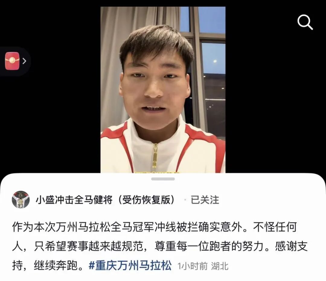 3月16日晚,盛雪李再次发文,表示自己作为本次万州马拉松全马冠军冲线被拦确实意外。不怪任何人,只希望赛事越来越规范,尊重每一位跑者的努力。感谢支持,继续奔跑。