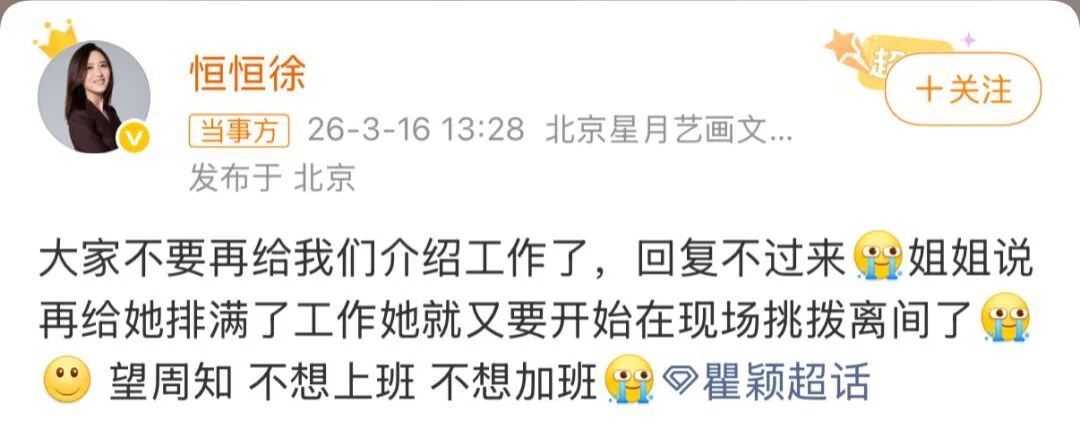 3月16日下午,瞿颖的经纪人发文,“凡尔赛”地恳请大家不要再给瞿颖介绍工作了。