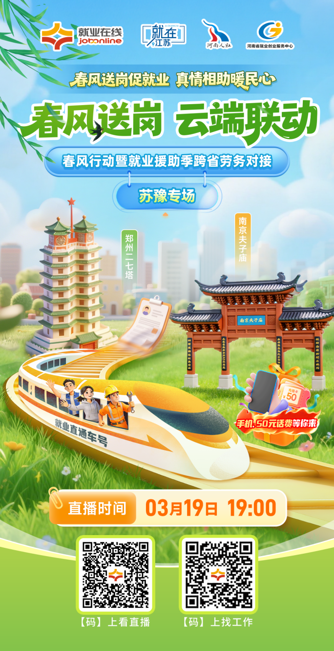 “春风送岗促就业 真情相助暖民心”,2026年春风行动火热进行中,“就业在线”平台开展春风行动暨就业援助季跨省劳务对接系列直播带岗活动。3月19日19:00,“就业在线”平台携手江苏省、河南省人力资源社会保障厅开展春风行动暨就业援助季跨省劳务对接苏豫专场直播,为您带来权威政策解读,优质岗位推介,专业求职指导,助力广大求职者就业。