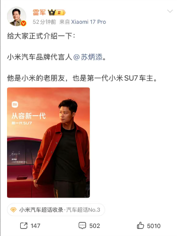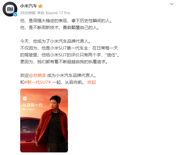 今天,他成为了小米汽车品牌代言人。不仅因为,他是小米SU7第一代车主:在日常每一天的驾驶里,他给小米SU7的评价只有两个字,“信任”。更因为,我们都有着不断超越自我的执着追求。