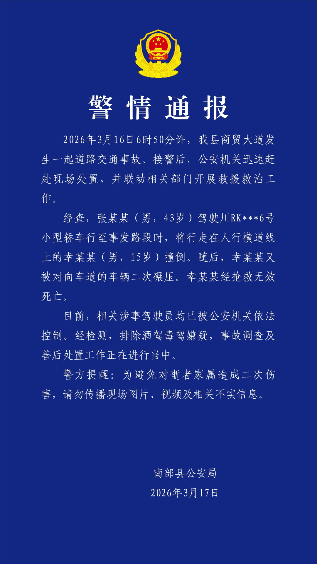 3月16日清晨,四川省南充市南部县商贸大道发生一起交通事故,一名高中生不幸身亡。事发时,该学生正在过马路,被一辆车撞至对向车道,随即遭对向车道一辆未能及时避让的车辆二次碾压。南部县交警大队已证实该事故发生。