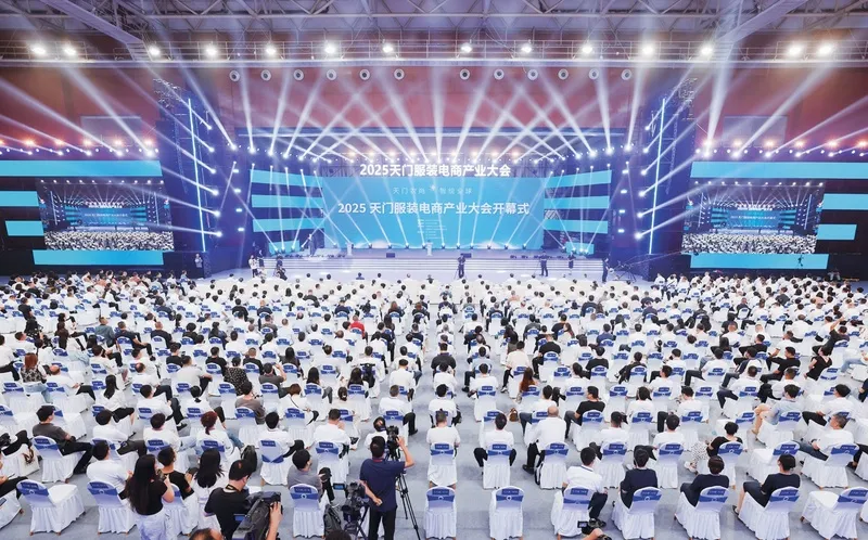 天门市将纺织服装产业作为主导产业,连续3年举办服装电商产业大会,每年培训服装相关专业人才近3000名,推动形成返乡就业创业蓬勃发展态势。图为2025年6月28日,以“天门衣尚 智绘全球”为主题的2025天门服装电商产业大会在天门市体育馆开幕。 湖北省天门市委宣传部供图