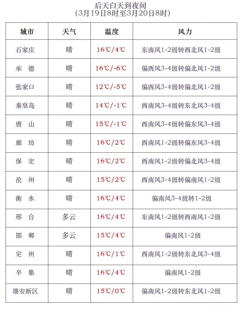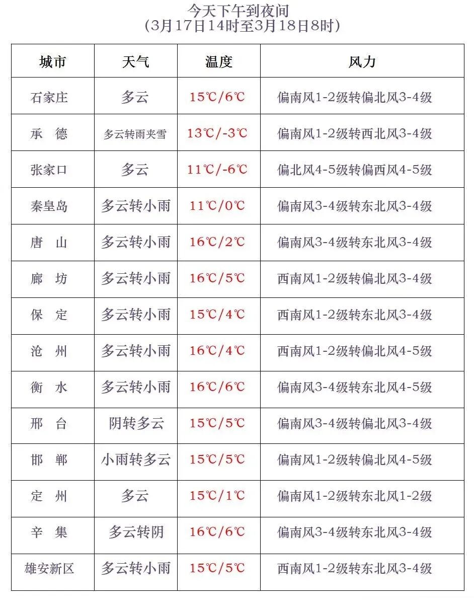 今天下午到夜间,邢台西部、邯郸西部和南部阴有小雨转多云,张家口北部、承德、唐山北部、秦皇岛北部多云转阴有小雪或雨夹雪,唐山中南部、秦皇岛南部、保定东部、雄安新区、廊坊、沧州、衡水、邢台东部、邯郸东部多云转阴有小雨或零星小雨,其他地区多云。