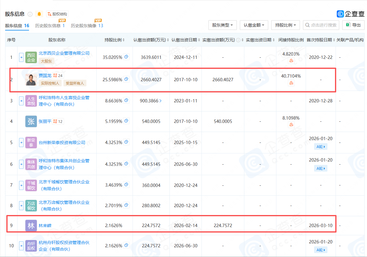 3月16日,内蒙古西贝餐饮集团有限公司(以下简称:“西贝”)发生工商变更,新增林来嵘为自然人股东,注册资本由约1.02亿元人民币增至约1.04亿元人民币。此次增资后,林来嵘持有西贝2.1626%的股份,位列公司第十大股东。