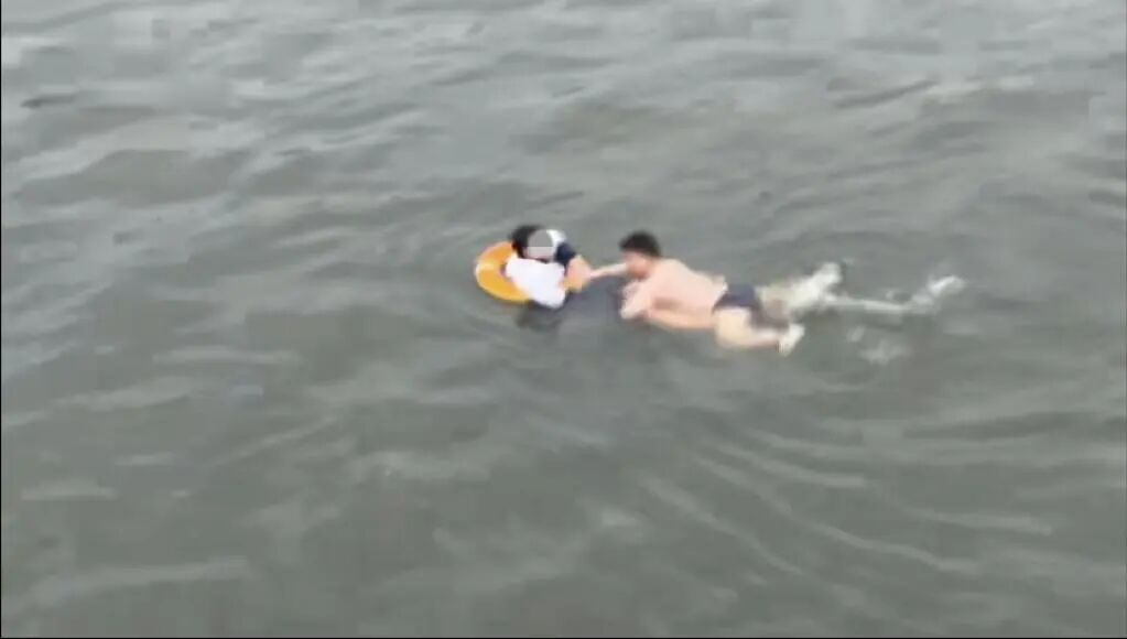 他抓着救生圈迅速往溺水男孩游去,中途他的小腿抽筋,“我捏了下腿,又继续往前游”。靠近男孩后,他注意到,男孩已经精疲力尽,脸色苍白,浑身发抖地说“想睡觉”。陈鑫豪赶紧将路人抛下的救生圈套到男孩身上,推着他向岸边游去。