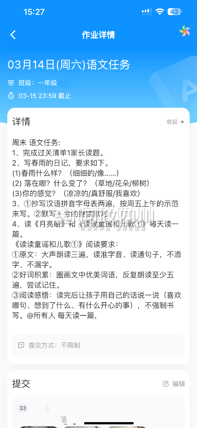 问政四川网友供图:家中一年级孩子3月14日语文任务截图。