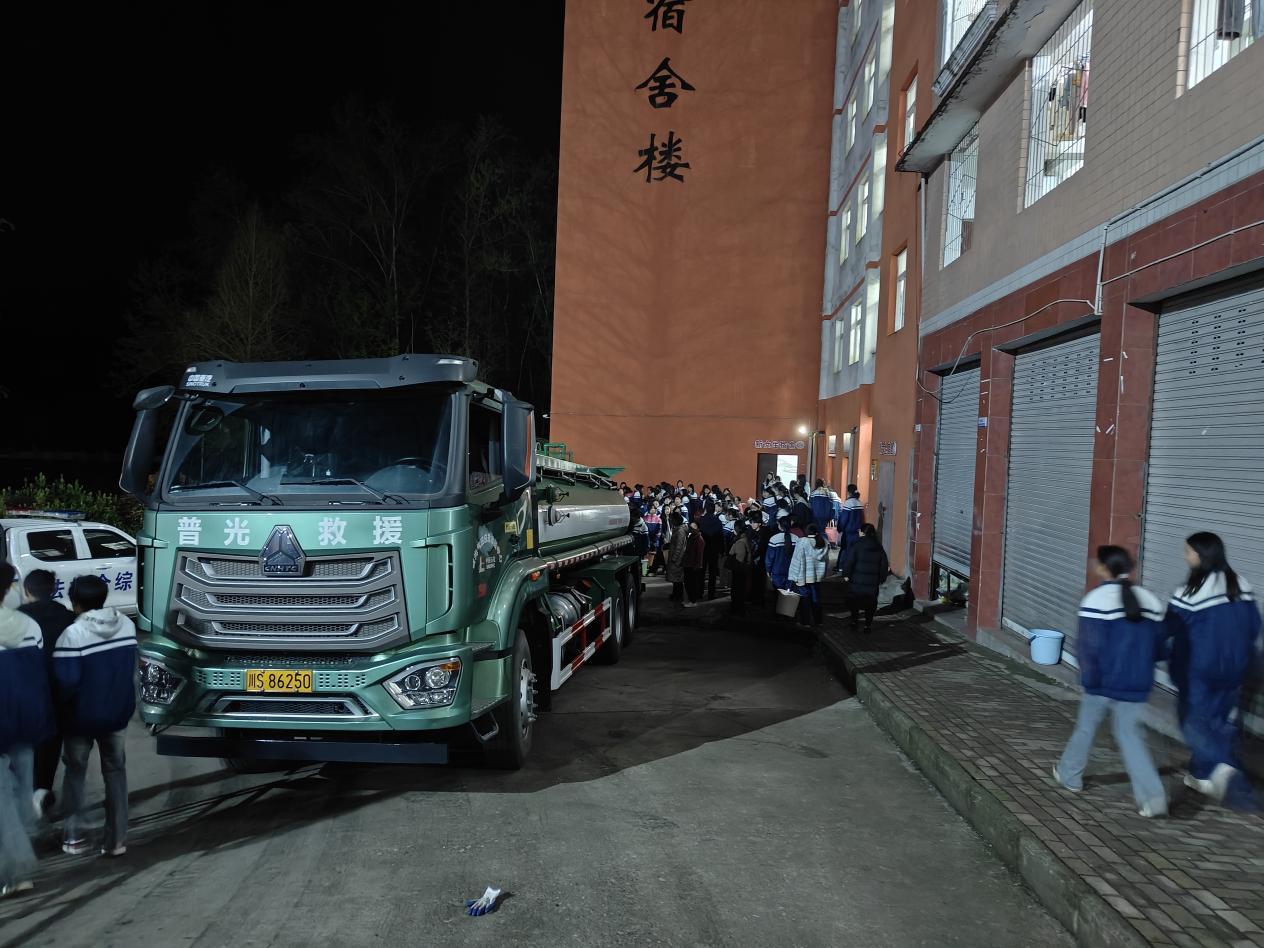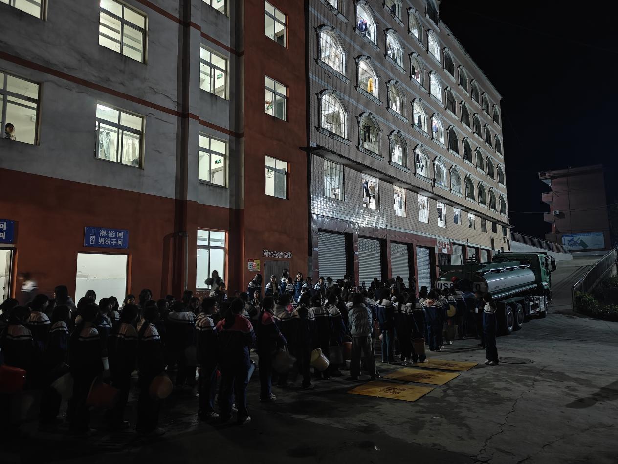 当日傍晚,宣汉县普光镇双桥社区自来水管网突发故障,导致双河中学全域停水。正值晚间洗漱时段,数千名师生的饮水、洗漱成了难题。接到学校求助后,普光分公司应急救援中心立即启动应急预案,4名骨干队员迅速集结,两辆清水罐车满载20立方米生活用水,驶向学校。