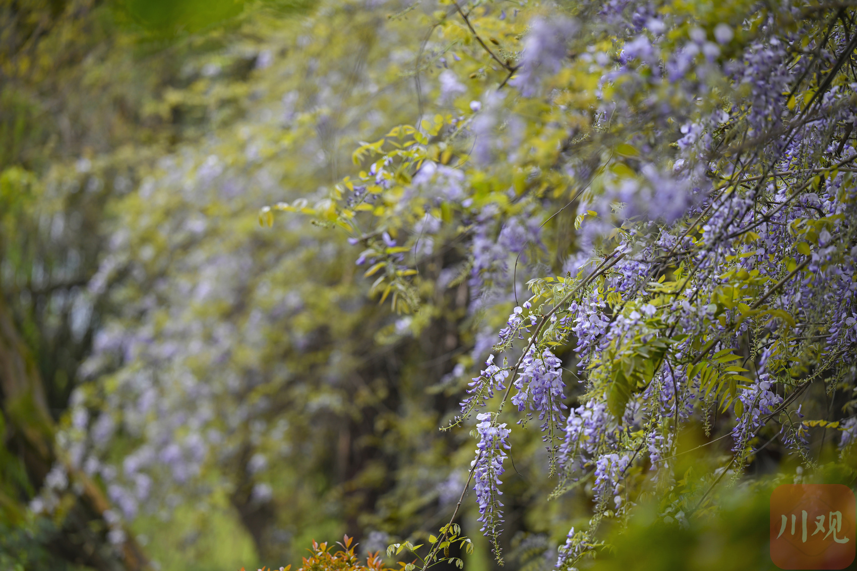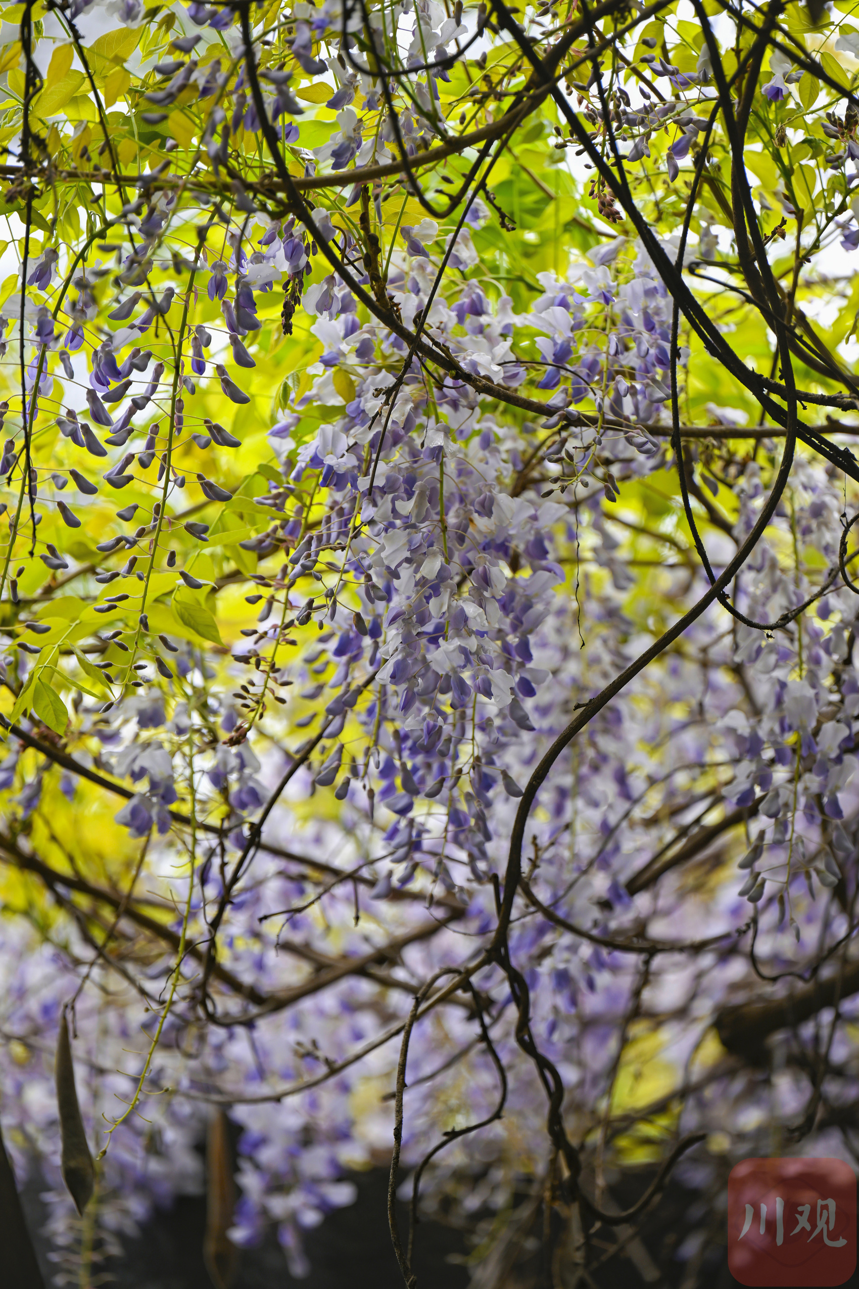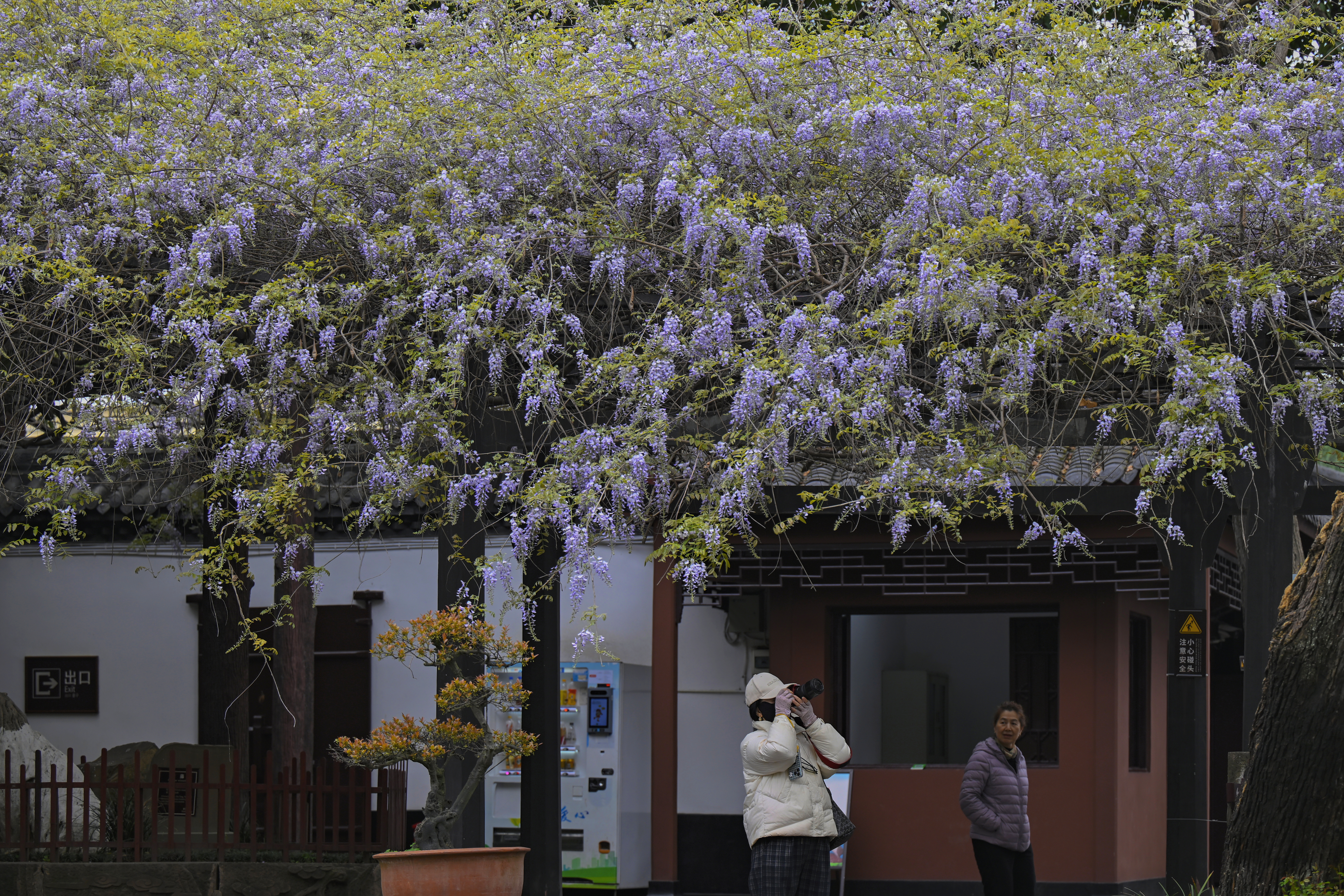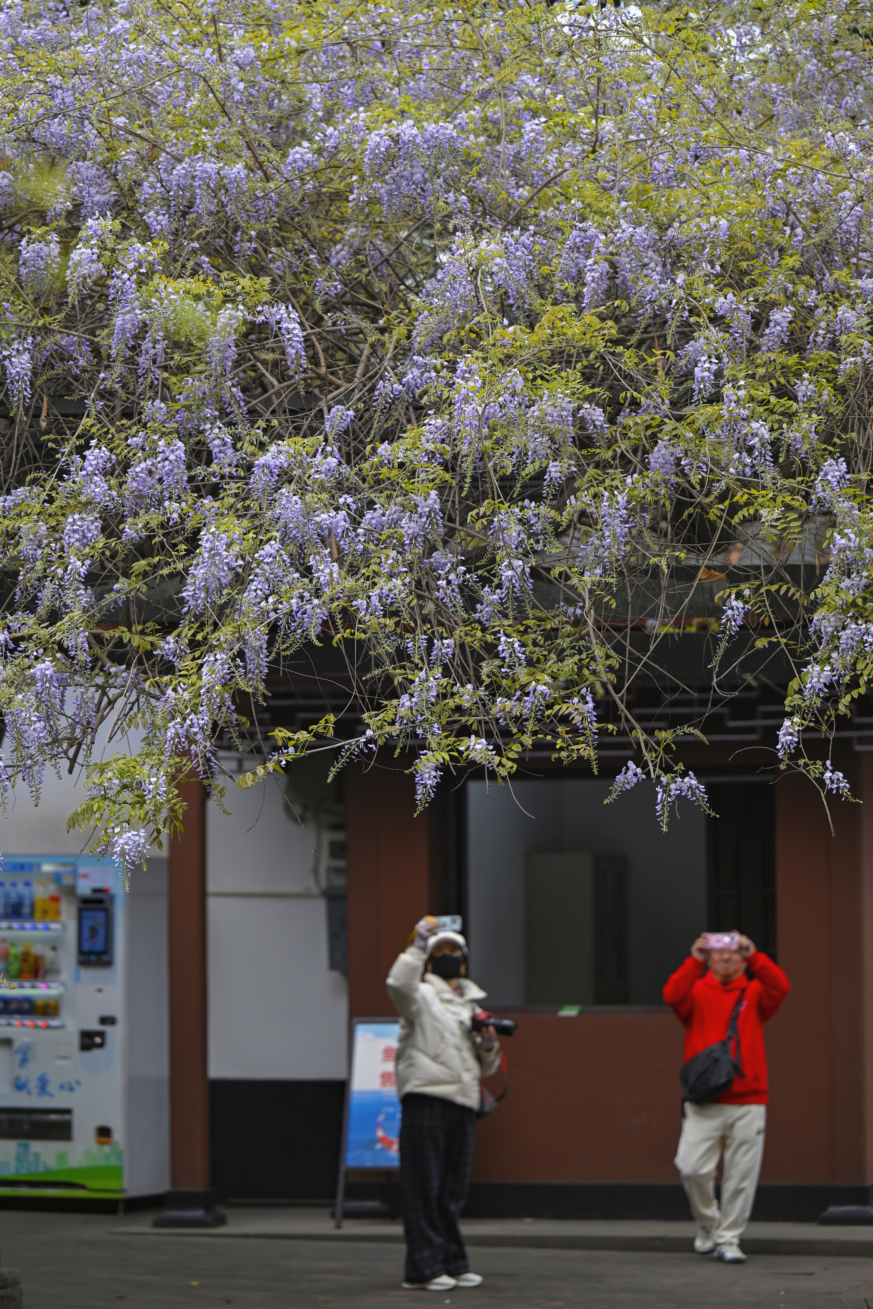 3月18日,位于成都市新都区桂湖公园内的两株百年紫藤古树绽放出淡紫色花串,即将迎来最佳赏花期。其中一株被誉为“中国藤王”的紫藤,枝叶繁茂如瀑,倾覆花架,形成“满园紫气”的春日奇观,吸引众多游客驻足流连。