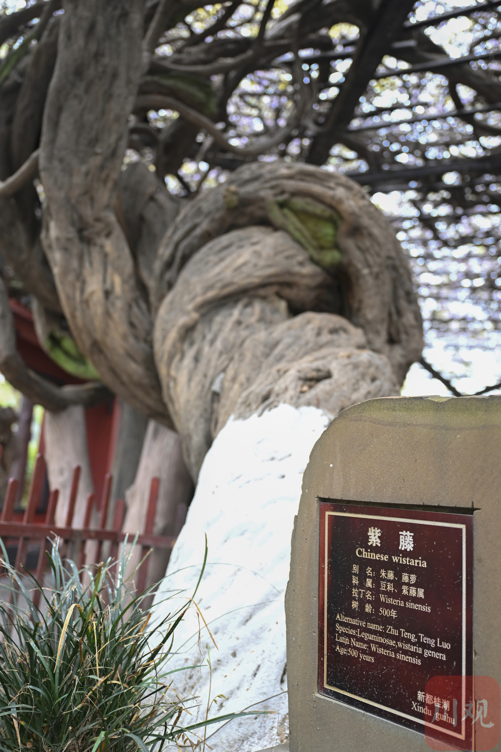 这两株紫藤承载着深厚的历史底蕴。其中一株为明代状元杨升庵500多年前衣锦还乡时亲手栽种,枝蔓蜿蜒攀附岩石,历经沧桑仍生机盎然;另一株则由其后人为纪念杨升庵夫人黄娥所植,亦有二百余年历史。两树相依相伴,被视为杨升庵与黄娥爱情故事的另一种延续,令游客感慨“时光在此凝结成诗”。