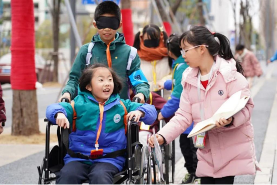 图为孩子们在麓湖公园社区实地调研,三人一组模拟残疾人出行,记录感受。