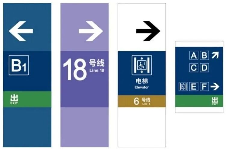 同时,标志应按统一风格进行设计和设置,确保车站内及同一线路各个车站之间,各类标志安装位置、安装形式、版面信息、牌体形式的一致性,便于乘客观察标志和识别信息。换乘站应对本站所有出口统一进行导向指引,并在选择出口的分岔点,对车站各个出口进行导向指引。