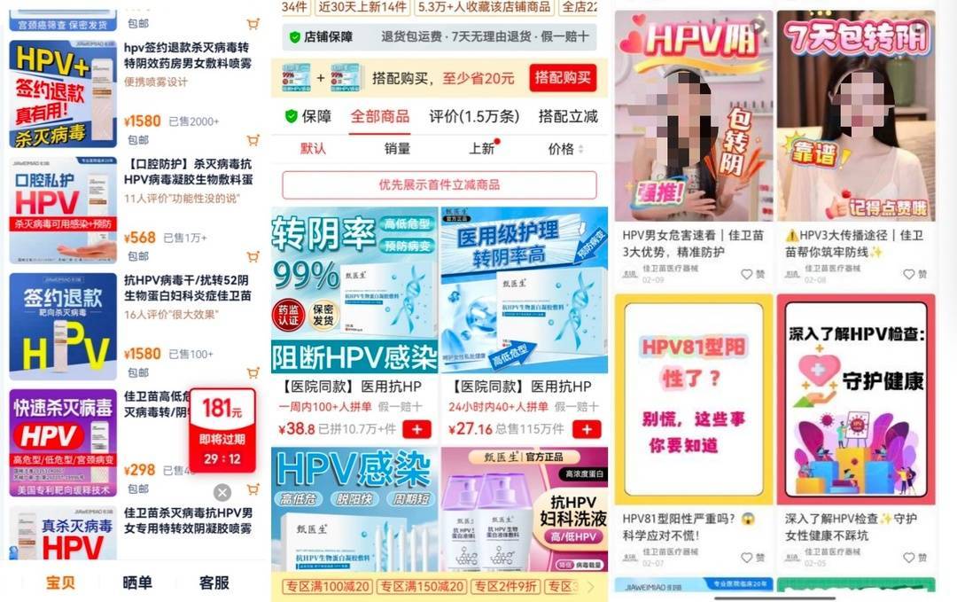 “无效退款”“不转阴不要钱”“200%能转阴”……以“HPV”为关键词在多个电商平台检索,有不少宣称能针对人乳头瘤病毒(HPV)感染的产品正在销售,部分商家更是直接在商品预览图或直播中给产品的功效、有效率作出承诺。