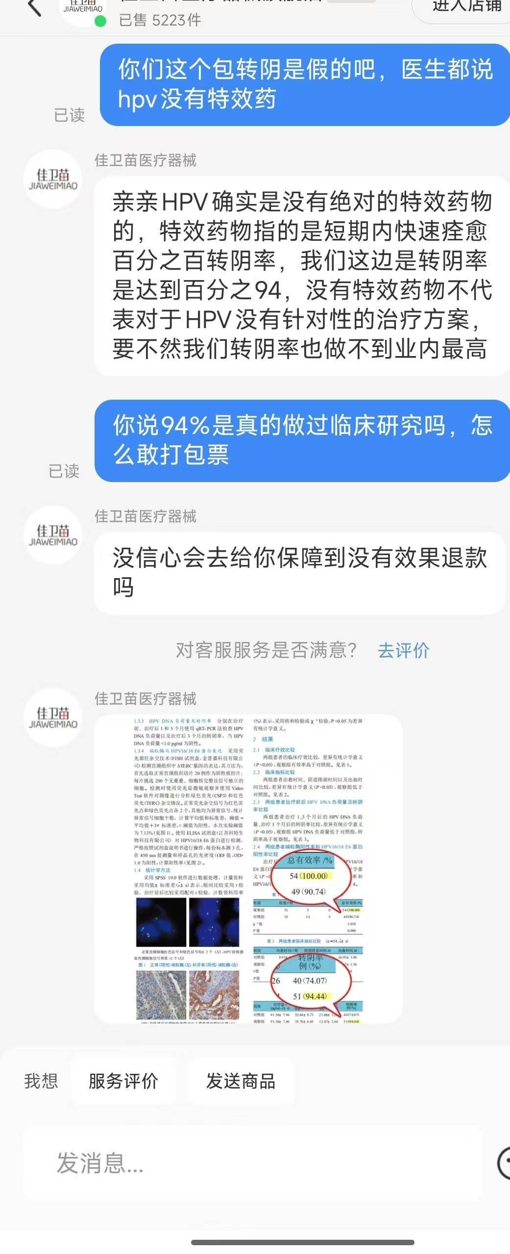 记者以消费者身份提出质疑后,客服仍表示,他们的转阴率高达94%,“没有特效药物不代表没有针对性治疗方案,不然我们转阴率也做不到业内最高”。随后客服又发来一页论文截图,图中重点圈出了“有效率100%、转阴率94%”这两个数据,并标注这是“佳卫苗长效抗菌材料临床真实有效率”,不过论文标题部分被打了马赛克。