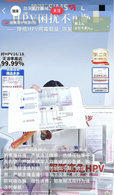 “三个疗程能转阴吗?200%能转阴!”在小红书简深医疗器械直播间内,一位主播对店内销售的“医用级抗HPV生物蛋白功能敷料”的功效作出了大胆承诺。