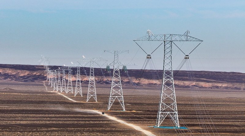 ±800千伏哈密—重庆特高压直流输电线路工程(新疆段)。(马元 摄)