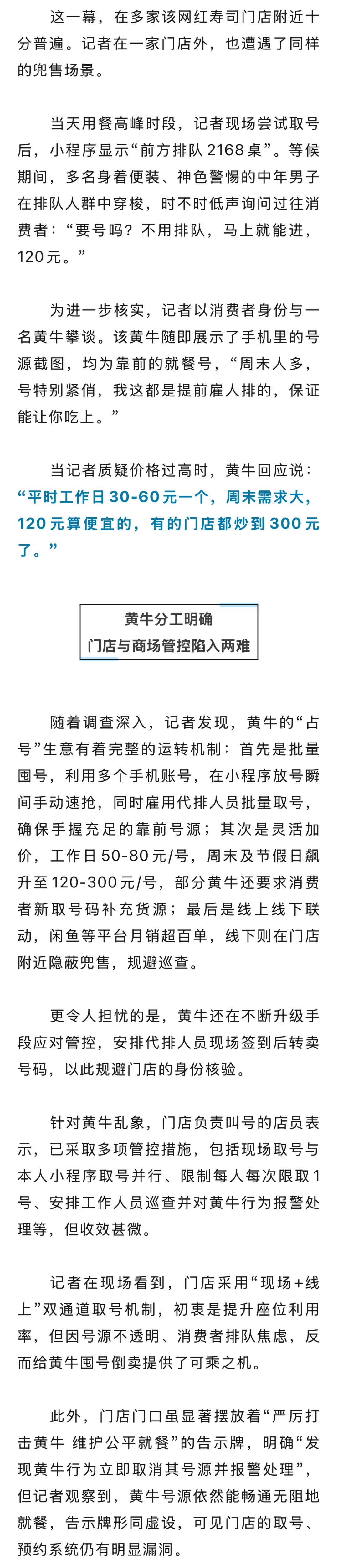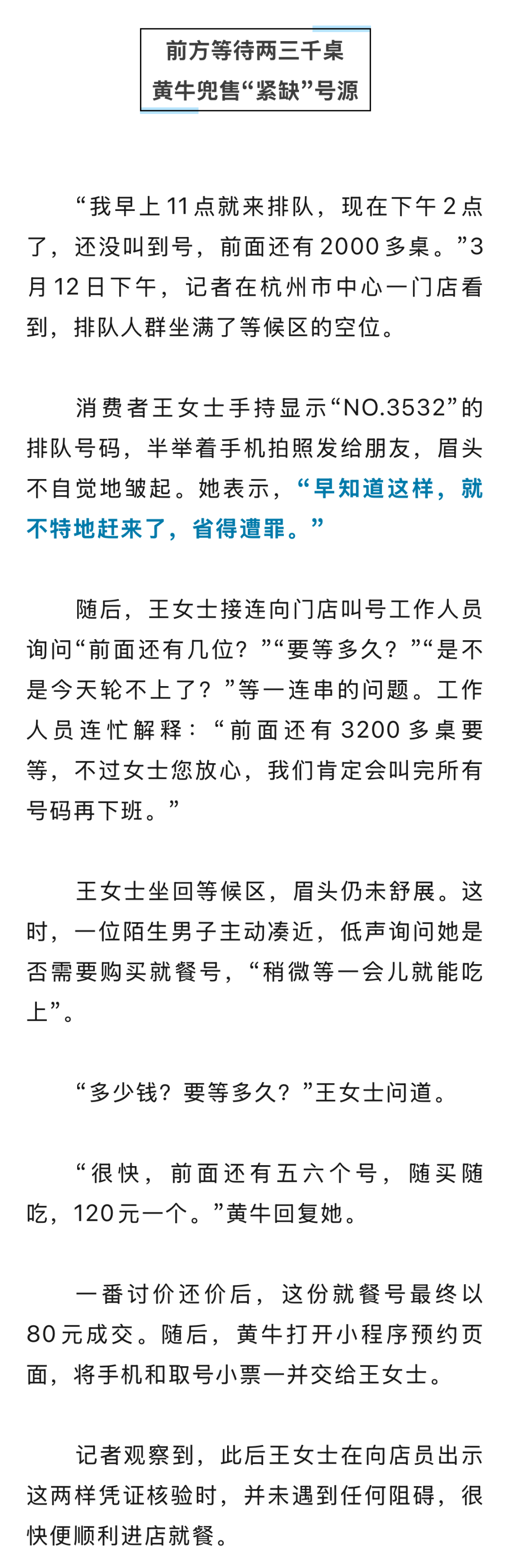 用餐高峰期取号困难,等位动辄两三千桌;线上预约排到一个月后;黄牛坐地起价,一个号卖到120元……